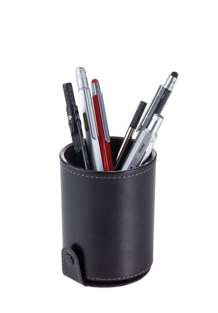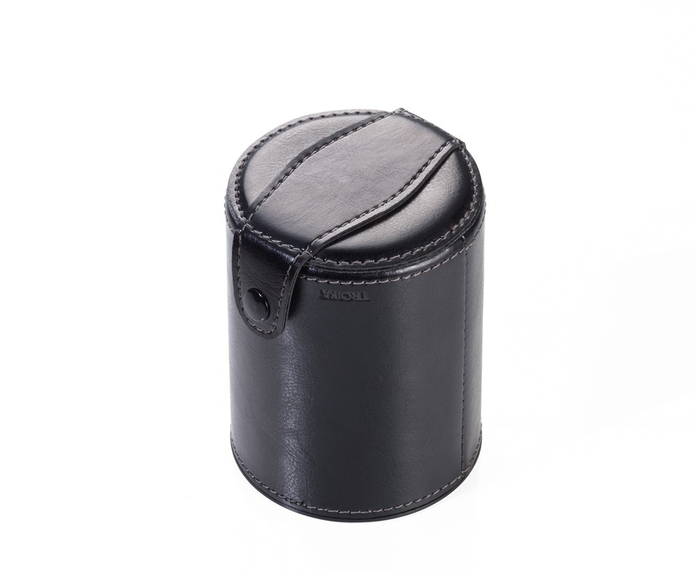 Würfelbecher und Stifteköcher, mit 5 Würfeln (schwarz mit weißen Augen), Würfel verstaubar im Fach am Boden des Bechers, Kunstleder, Samt, schwarz