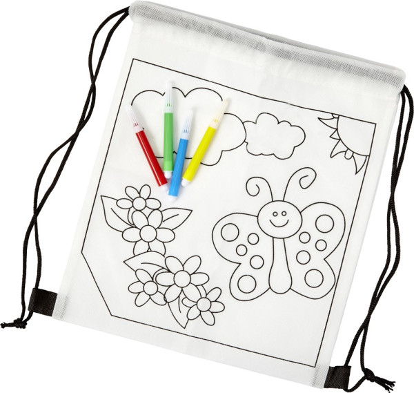 Turnbeutel aus Polyester, mit Schultergurten aus Kordeln, 4 Filzstiften (Rot, Gelb, Grün, Blau) zum Ausmalen des Bildes auf der Vorderseite.