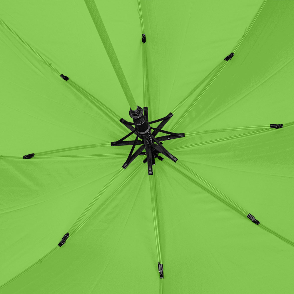 Der Gasschirm hat eine Länge von ca. 93 cm (geschlossen) und lässt sich automatisch öffnen. Er besteht aus 8 Segmenten und einem 14 mm Fiberglasschaft in der Farbe der Bespannung. Mit 68 cm langen Doppel-Fiberglasspeichen in der gleichen Farbe wie die Bespannung bietet der Schirm hohe Stabilität. Ausgestattet mit einer Windproof-Funktion trotzt er auch stärkeren Winden. Der PU-beschichtete, gerade Handgriff mit Farbakzenten in der Farbe der Bespannung sorgt für einen komfortablen Halt. Eine Doming-Veredelung im Griff ist möglich.