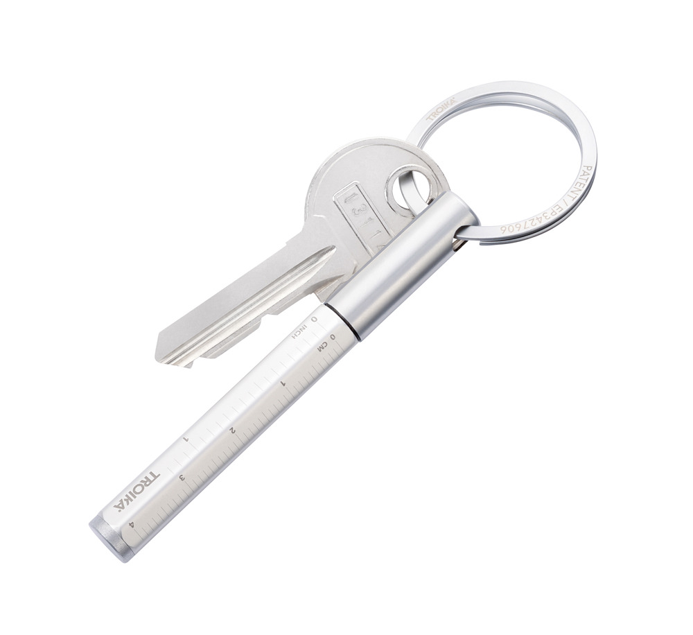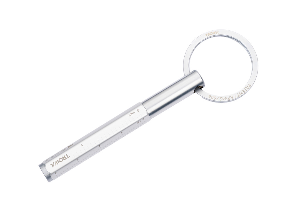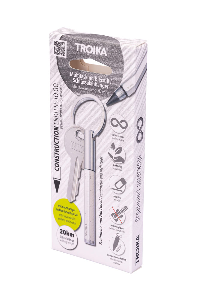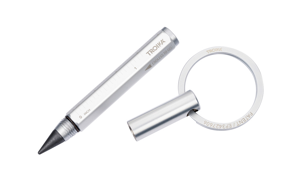 Multitasking-Bleistift und Schlüsselanhänger mit nachhaltiger Endlos-Schreibspitze (ca. 20km Schreiblänge), schnelles & einfaches Anbringen der Schlüssel dank patentiertem Öffnungsmechanismus (TROIKA NAIL GUARD), Zentimeter-/Zoll-Lineal, HB, radierbar, ohne Anspitzen, Schreibspitze austauschbar, Aluminium, matt, silberfarben