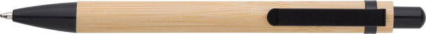 Kugelschreiber aus Bambus, mit Metall-Clip, -Spitze und Drücker. Mit blauer Mine.