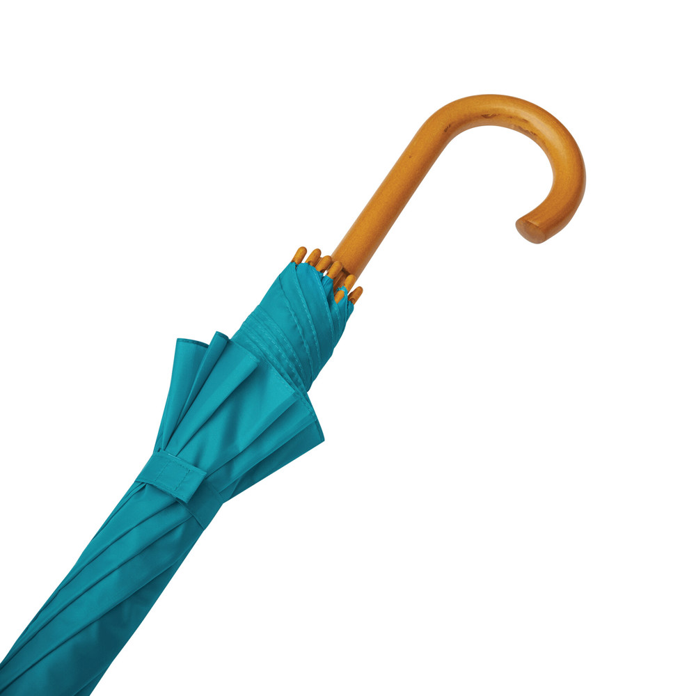 Automatik-Holzstockschirm JAZZ: Fiberglasspeichen, Holztips und -Rundhakengriff, Polyester-Bespannung aus recycelten Kunststoffen / RPET, Schließband mit Klettverschluss