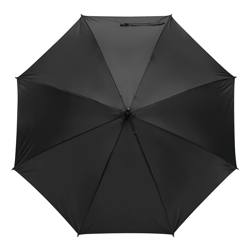 Automatik-Holzstockschirm JAZZ: Fiberglasspeichen, Holztips und -Rundhakengriff, Polyester-Bespannung aus recycelten Kunststoffen / RPET, Schließband mit Klettverschluss