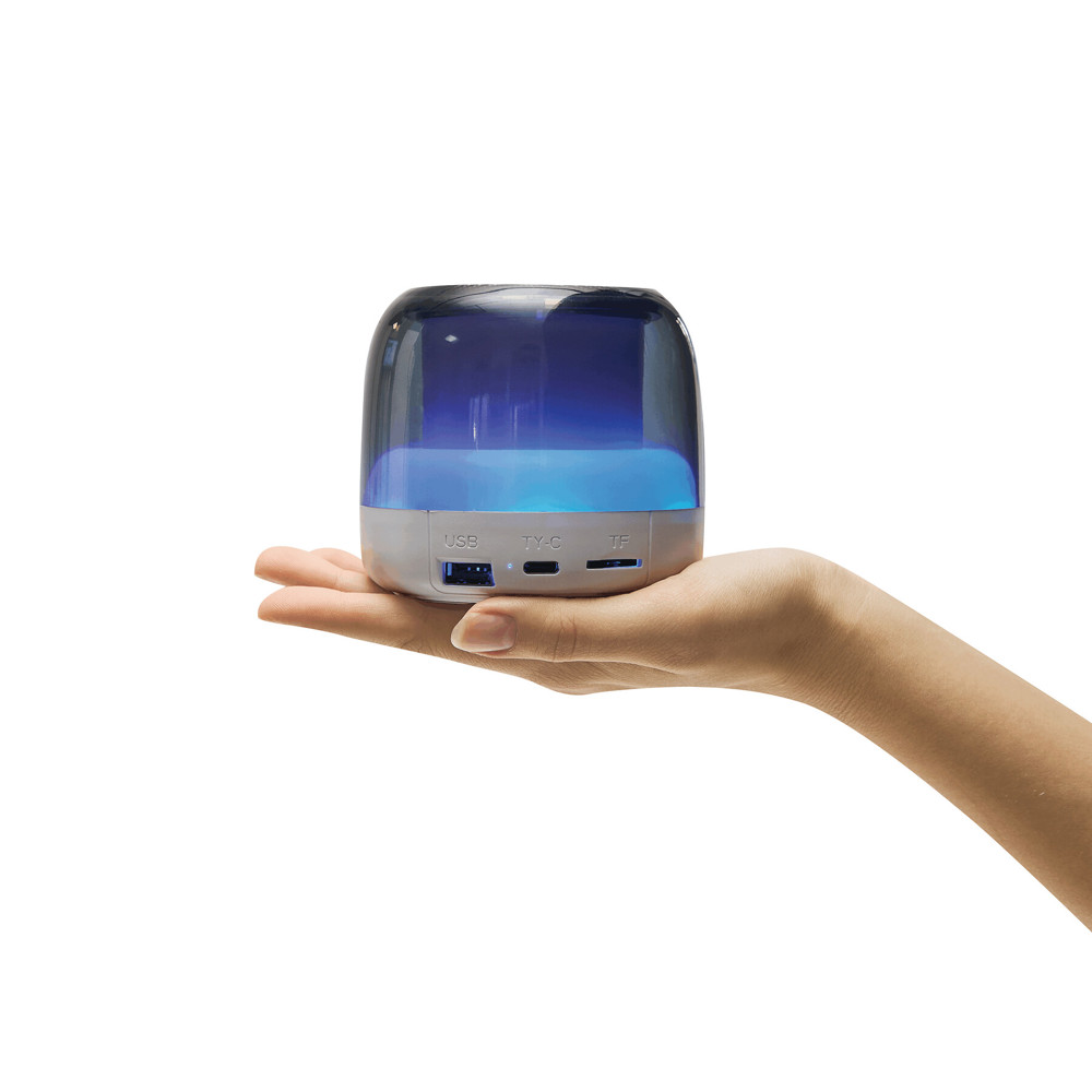 Wireless-Lautsprecher WHITE OYSTER: Musikleistung 5 Watt, zur Kopplung mit wireless-fähigen Geräten, kompatibel zu Bluetooth®, Reichweite ca. 10 m, microSD-Slot und USB Typ A Anschluss für MP3-Funktion, Freisprechfunktion, leistungsstarker Lithium-Akku, Kapazität: 800 mAh, inkl. USB-Ladekabel mit USB Typ C Stecker (Länge: ca. 50 cm), mit farbwechselndem Licht sowie Dauerlicht (abschaltbar), Bedientasten sowie An- und Ausschalter auf der Unterseite und rutschhemmenden Standfüßen, in Box