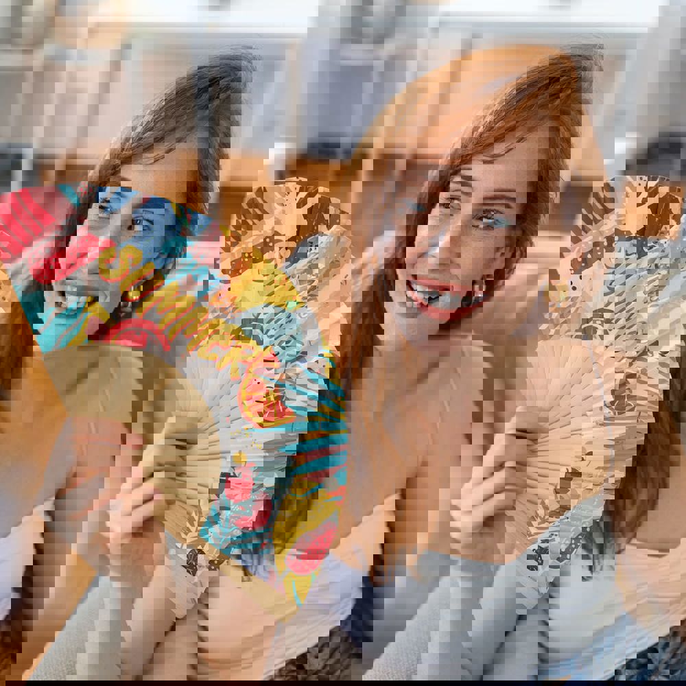 Besiegen Sie die Hitze mit einem Fächer aus Holz und R-PET. Erhältlich in verschiedenen leuchtenden Farben und mit einem Holzgriff; ideal für Veranstaltungen im Freien und heiße Sommertage.