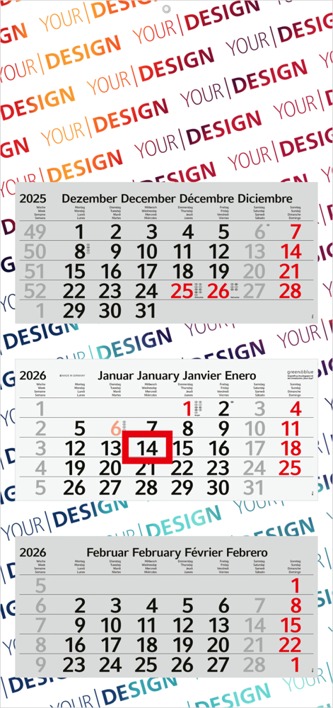Der Profil 3 green+blue kombiniert Umweltbewusstsein mit praktischer Funktionalität. Mit seinem Kalendarium aus Recyclingpapier, ausgezeichnet mit dem Umweltzeichen „Blauer Engel“, überzeugt dieser Kalender durch seine nachhaltigen Materialien. Mit einer großzügigen Werbefläche, einem viersprachigen Kalendarium und einer portooptimierten Verarbeitung ist der Profil 3 green+blue die ideale Lösung für umweltbewusste Unternehmen. „Made in Germany“ – Qualität und Nachhaltigkeit in perfekter Harmonie.