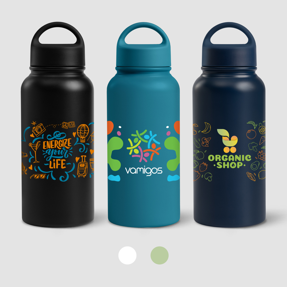 Entdecken Sie die Mariner - 915 ml Edelstahlflasche - Doppelwandig, die ideale Lösung für Unternehmen, die nach hochwertigen Werbeartikeln oder Werbegeschenken suchen. Diese doppelwandige, vakuumisolierte Flasche, die innen und außen aus recyceltem 304er Edelstahl gefertigt ist, sorgt für eine optimale Temperaturerhaltung. Sie hält Getränke bis zu 12 Stunden lang heiß und Getränke bis zu 24 Stunden lang kalt und ist damit perfekt für jede Gelegenheit. Die Flasche hat ein mattes Finish mit Sprühlackierung und verleiht ihr einen eleganten und trendigen Touch. Mit einem Fassungsvermögen von 915 ml sorgt der PP-Deckel für einen sicheren Halt, während der integrierte Griff Bequemlichkeit für unterwegs bietet. Beachten Sie, dass diese Flasche nicht spülmaschinen- oder mikrowellengeeignet ist. Verpackt in einem Polybag ist die Mariner-Flasche eine elegante und praktische Wahl für den täglichen Gebrauch, für Firmenveranstaltungen, Kundengeschenke und Werbeverteilungen.