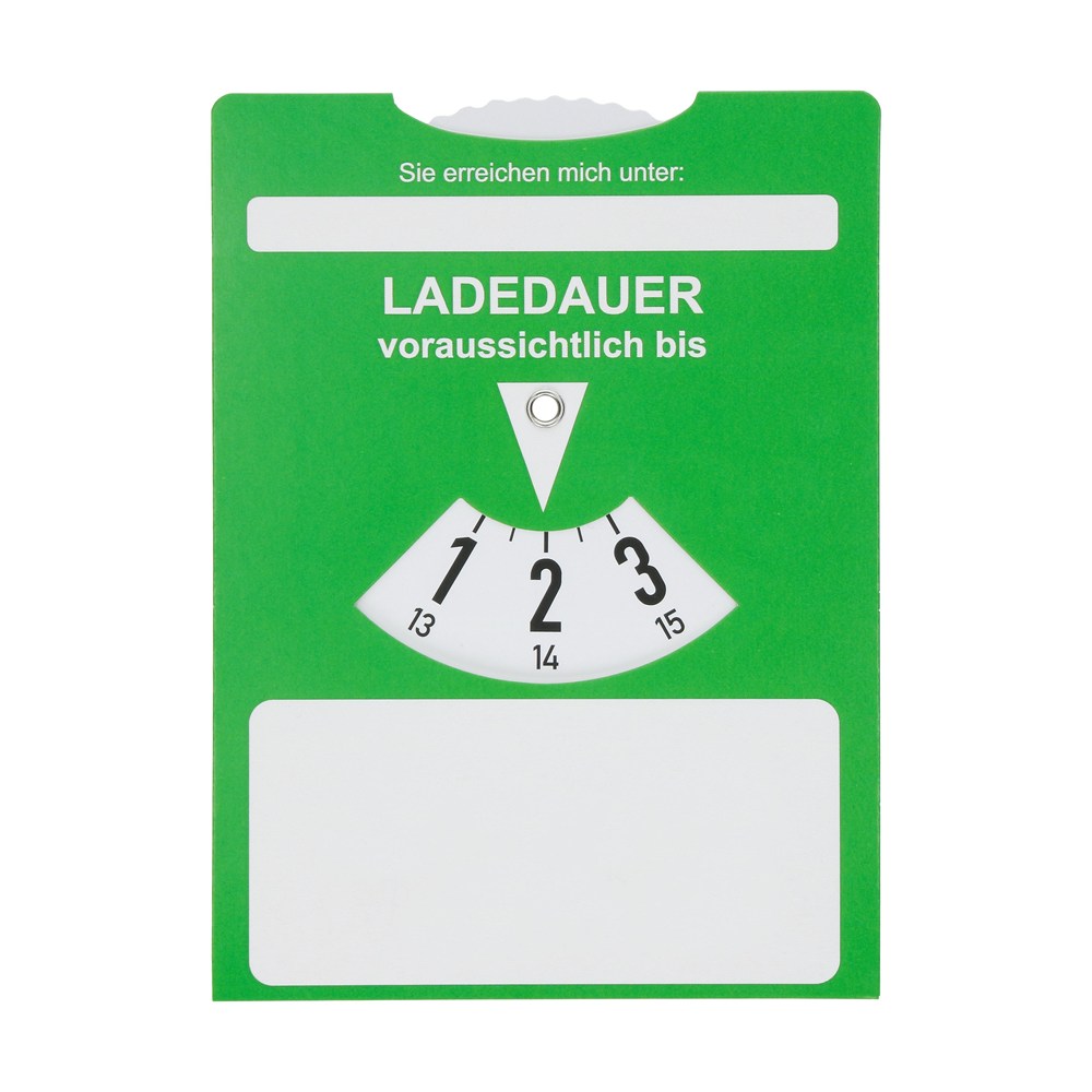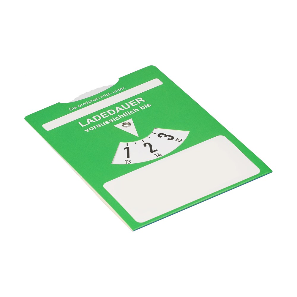 Die ideale Parkscheibe für das E-Fahrzeug. Die klassische Karton-Parkscheibe auf der Vorderseite mit zusätzlicher Ladezeitanzeige auf der Rückseite. Alternativ zur Parkdauer, kann somit auch die Batterie-Ladedauer eingestellt werden. Inklusive Feld zum Hinterlassen der Kontaktdaten. Die Parkscheibe entspricht Paragraph 42 StVO.