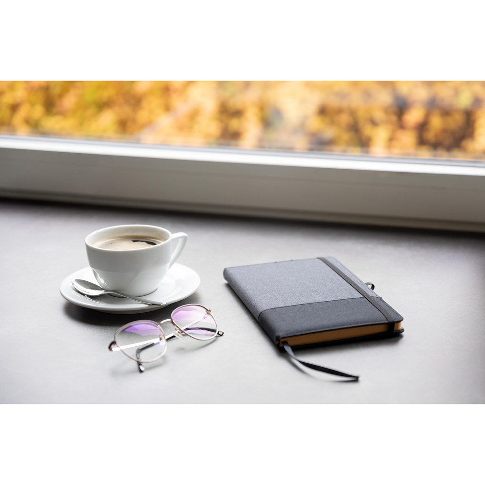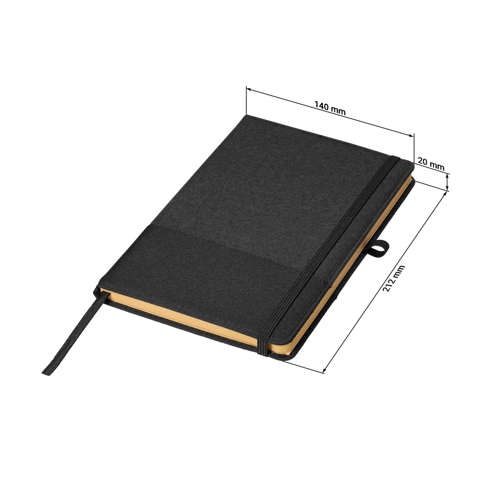 Das Notizbuch "Journal" in A5 ist die umweltfreundliche Wahl für Ihre Gedanken und Ideen. Gefertigt aus nachhaltigem RPET und ausgestattet mit recyceltem, kariertem Papier, bietet es ein praktisches Format von 21 x 14 cm. Mit integriertem Lesezeichen, Stiftehalter und elastischem Verschlussband ist es perfekt für den Alltag – stilvoll, funktional und umweltschonend