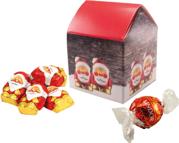 Unser süßes Weihnachtshäuschen ist ideal als Giveaway in der Adventszeit. Die Lindt Schoko-Kugel und die Schoko-Weihnachtsmännchen sind immer willkommen. Ihre Werbebotschaft kann im Standardmotiv platziert werden. Eine individuelle Gestaltung ist ebenfalls ab 250 Stück möglich.