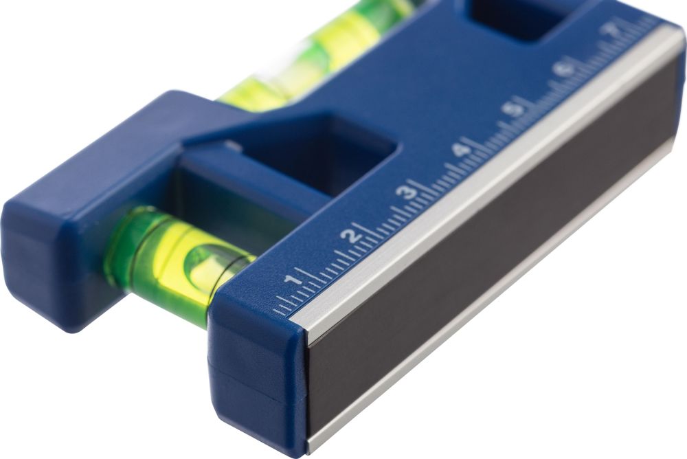 Schlüsselanhänger aus recyceltem ABS mit Magnet-Wasserwaage und Größenangabe auf der Vorderseite.... mehr