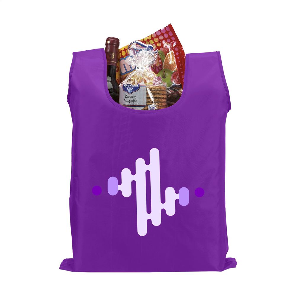 Faltbare Einkaufstasche aus 190T Polyester. Mit Aufbewahrungshülle mit Druckknopf und Karabinerhaken. Die Tasche wird ungefaltet mit separatem Beutel geliefert. Maße gefaltet: 6 x 2,5 x 12,5 cm. Fassungsvermögen ca. 8 Liter