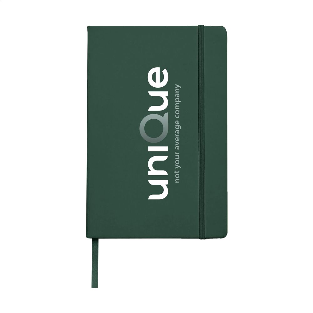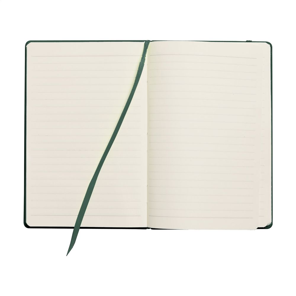 Notizbuch im A5-Format mit ca. 96 Blatt/192 Seiten crèmefarbenem, liniertem FSC Mix zertifiziertes Papier (80 g/m²). Mit gebundenem Rücken und hartem Umschlag, Verschlussgummi und seidener Leselitze.