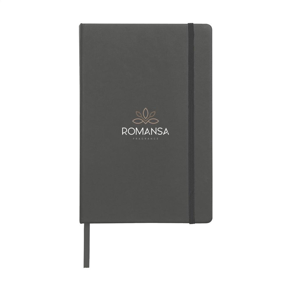 Notizbuch im A5-Format mit ca. 96 Blatt/192 Seiten crèmefarbenem, liniertem FSC Mix zertifiziertes Papier (80 g/m²). Mit gebundenem Rücken und hartem Umschlag, Verschlussgummi und seidener Leselitze.