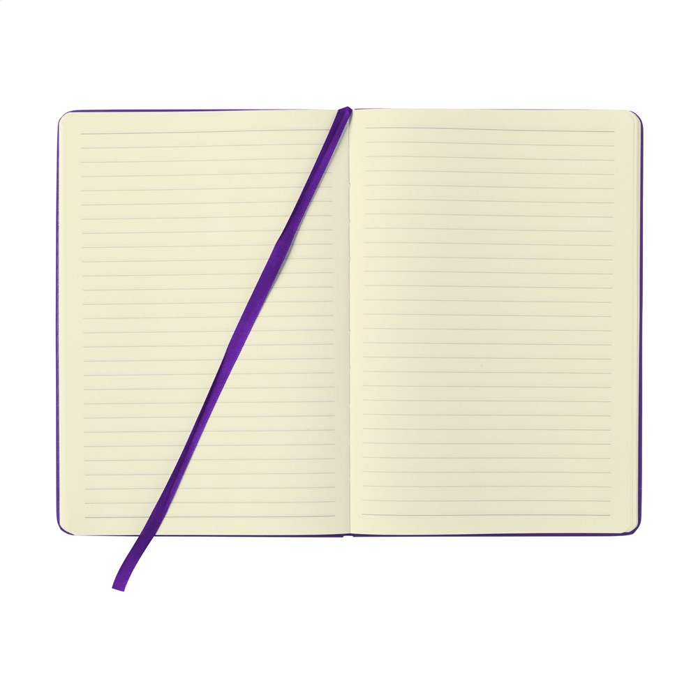 Praktisches Notizbuch im A5-Format. Mit festem PU-Überzug, ca. 80 Seiten cremefarbenem, liniertem FSC Mix zertifiziertes Papier (70 g/m²), elastischem Verschluss und Leseband.