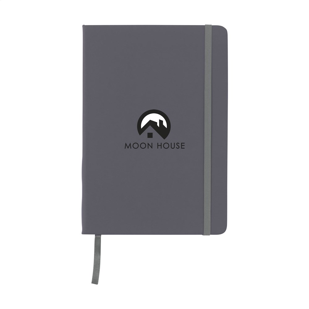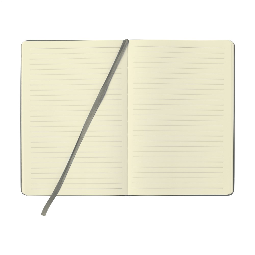 Praktisches Notizbuch im A5-Format. Mit festem PU-Überzug, ca. 80 Seiten cremefarbenem, liniertem FSC Mix zertifiziertes Papier (70 g/m²), elastischem Verschluss und Leseband.