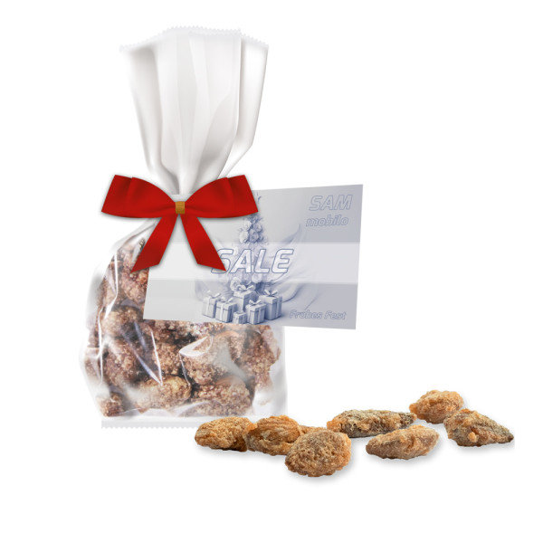 Feuergebrannte Mandeln ohne Zuckerzusatz, ca. 30g, Express Flachbeutel mit Schleife mit Werbekarte