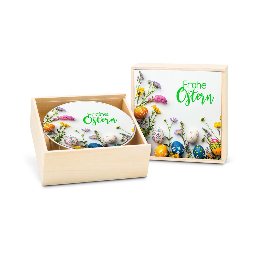 Sie planen ein Osterfrühstück im Büro oder möchten Kunden und Geschäftspartner zu Ostern eine besondere Freude machen? Dann darf der passende Osterkuchen nicht fehlen. In der wiederverwendbaren Holzkiste mit dekorativem „Frohe Ostern“-Aufleger wartet ein nach traditionellem Bäckerhandwerk gefertigter, frisch gebackener Schoko-Quarkkuchen (450 g) - ganz ohne Geschmacksverstärker, künstliche Zusätze oder Konservierungsstoffe. Eine saftige Quarkschicht, verfeinert mit zarter Schokolade, ruht auf knusprigem Mürbteig. Das ist nicht nur geschmacklich überzeugend: Der stabile Boden sorgt dafür, dass sich der Kuchen sauber aus der Hand genießen lässt - egal ob beim Osterbrunch, im Büro oder unterwegs. Das Besondere an diesem Kuchen? Er schmeckt überall wie frisch gebacken.