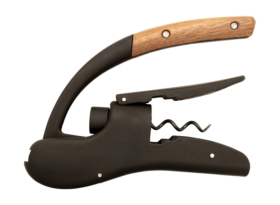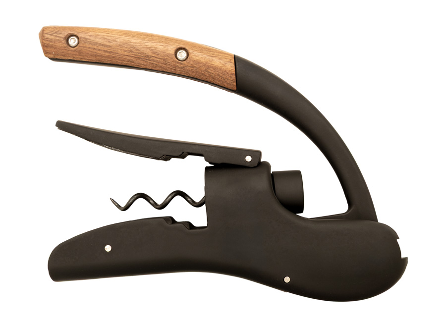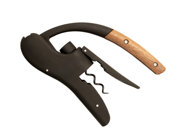 Zinklegierung mit ABS-Beschichtung und soft-touch Gummifinish. Griffspitze aus Akazienholz. Korkenzieherspindel aus Edelstahl mit schwarzer Antihaftbeschichtung. Doppelte Auflagepunkte am Flaschenhals, mit federunterstütztem Klemmgriff und rutschfester Innenbeschichtung. Wippmechanismus für sanftes Öffnen. Integrierter Folienschneider.
