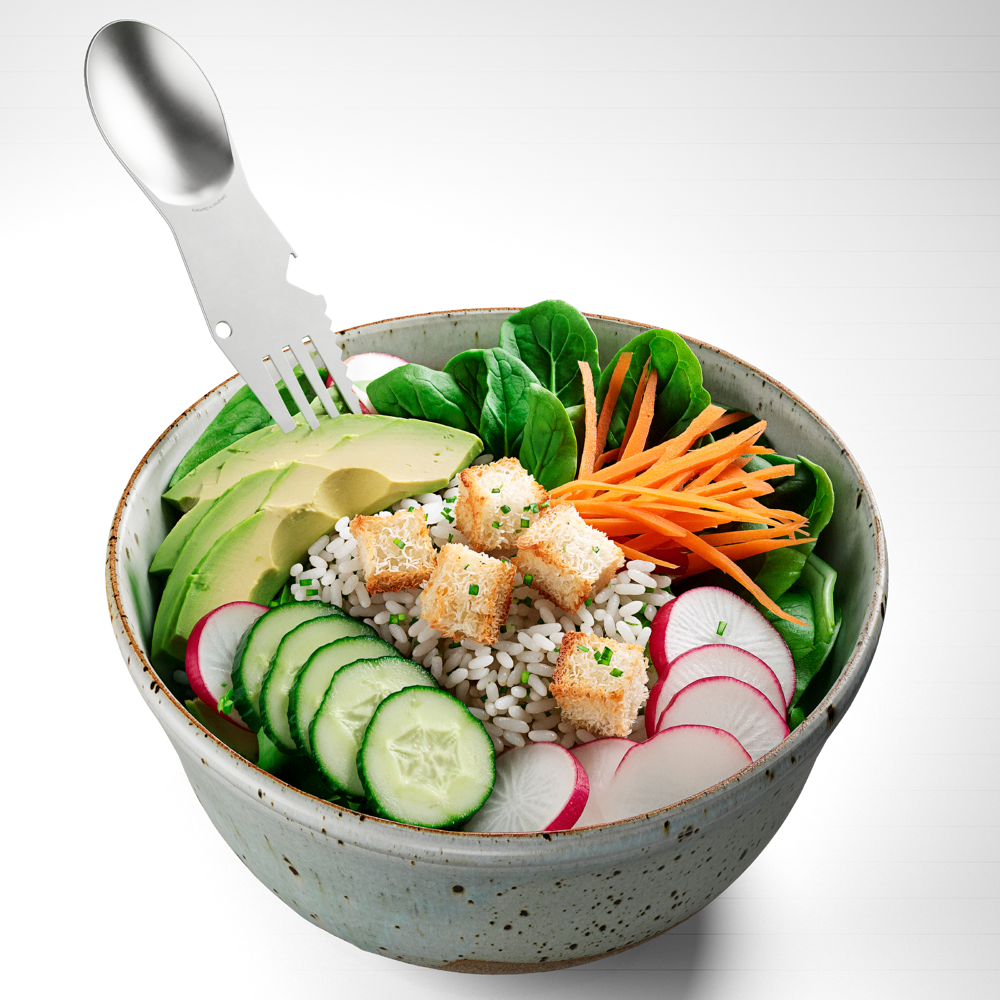 Wenn Gabel, Löffel, Messer und Öffner an einem kompakten Tool zusammenkommen, sieht dasklar nach einem guten, kompletten Diner aus. Mitdem vollwertigen Löffel und der Gabel mit gezahnter Schneide ist jedes Gericht schnell verputzt und auchder Drink dazu wird im Handumdrehen geöffnet.Ab jetzt kann das Einwegbesteck einpacken, dennSNACKTOOL wird Dich für eine lange Zeit begleiten!