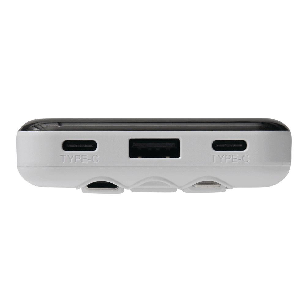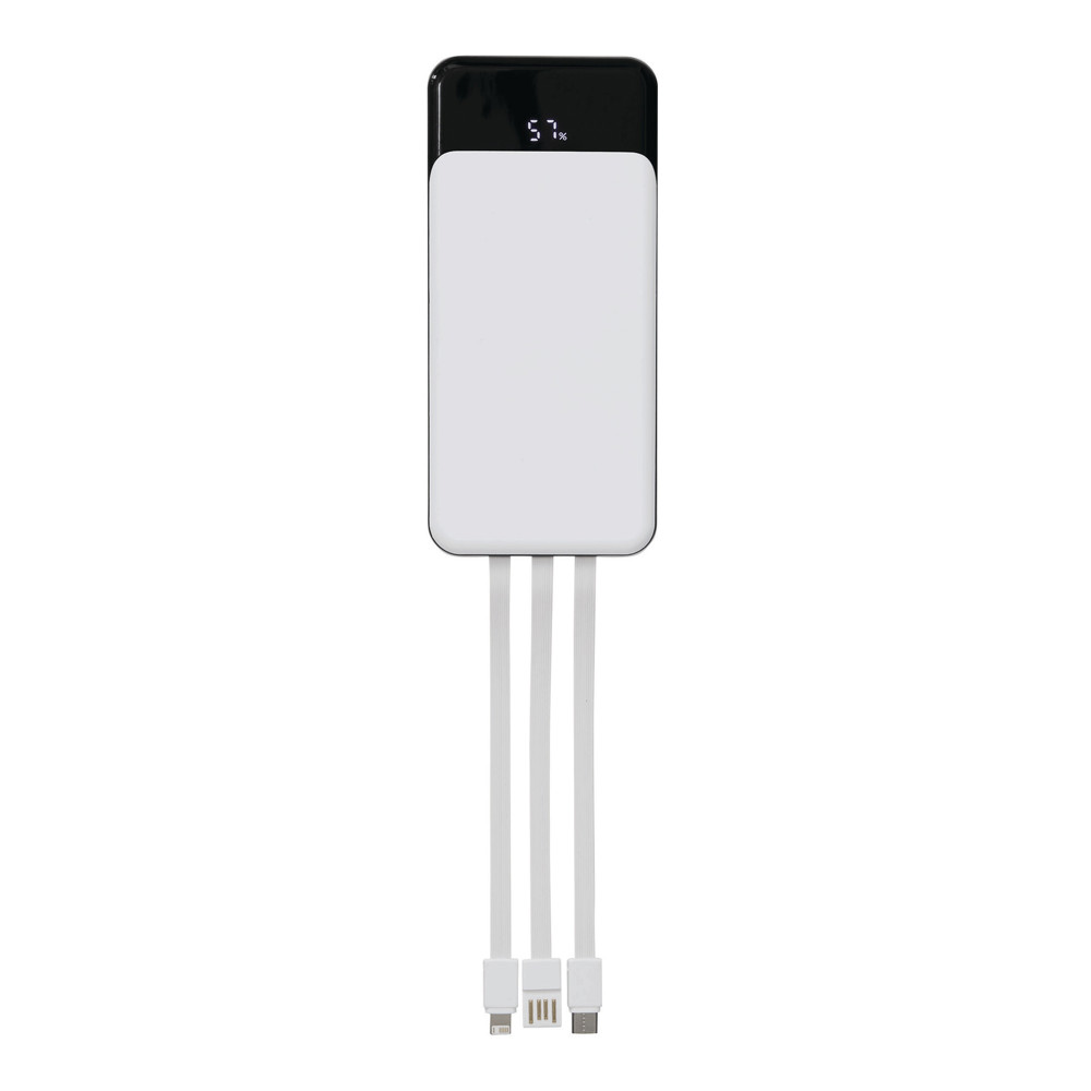 Powerbank POWERSTOCK: geeignet für Smartphones und USB-betriebene Geräte, inkl. 3 integrierter Ladekabel auf der Rückseite (USB Typ C, Lightning®, USB Typ A), mit Ladestandanzeige in Prozent, Ein- und Ausschalter, 2 USB Typ C Ein- /Ausgänge und 1 USB Typ A Ausgang, Eingangsleistung: 5V/2A, Ausgangsleistung: 5V/2A (max.), Kapazität: 10.000 mAh, leistungsstarker Lithium-Akku, in Box
