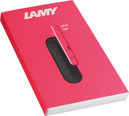 Der LAMY pico läuft unter Druck zu ungeahnter Größe auf: Der innovative Pocket Pen verwandelt sich dank einer raffinierten, doppelten Druckmechanik in seinem Inneren mit nur einer Fingerbewegung in einen Full-Size Kugelschreiber. Auffallend anders und überraschend bringt er als handlicher Alltagsbegleiter ein Stück Innovation in jedes noch so kleine Stifte-Etui oder sogar die Hosentasche. Und auch als Geschenk garantiert er den Wow-Effekt – nicht zuletzt aufgrund der außergewöhnlichen Farbauswahl. Manchmal sind es eben die kleinen Dinge im Leben. Mit einem Lamy-Set zeigen Sie, wie Rundum-Service funktioniert.Auf Wunsch können die Sets auch mit einem individuell bedruckten Schuber bestellt werden (auf Anfrage).