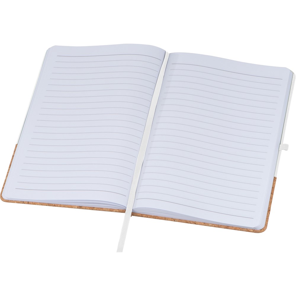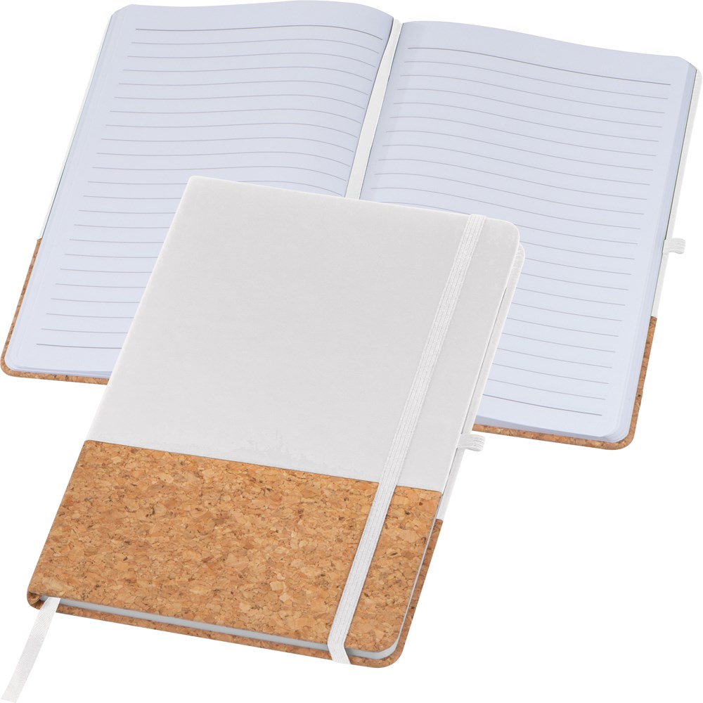 A5 Notizbuch mit 160 linierten Seiten und PU-Kork Cover, Lesezeichen, Kugelschreiberschlaufe und elastischem Verschlußband. Ihre Werbung drucken wir auf die Vorderseite.