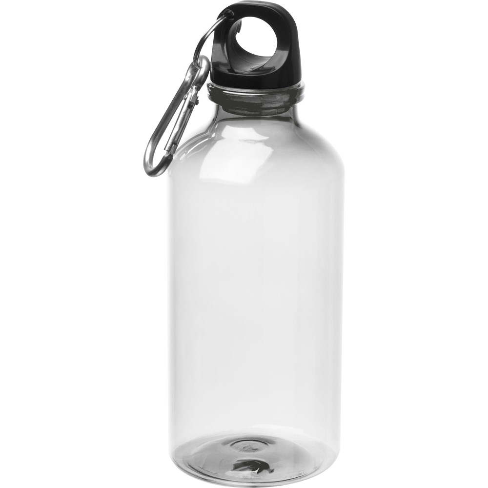 Trinkflasche aus PET mit auslaufsicherem Verschluss, Karabinerhaken und einem Füllvermögen von 400 ml. Die Werbung wird auf die Flasche gedruckt.