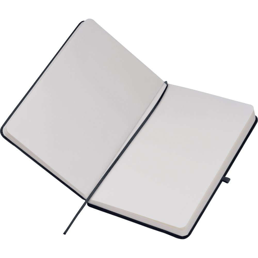 TOP PRICE! Notizbuch A5 im samtweichen PU-Einband, Kugelschreiberschlaufe, Lesezeichen, Gummiverschlussband und 160 Blankoseiten. Ihre Werbung drucken wir per Tampondruck auf das Cover.