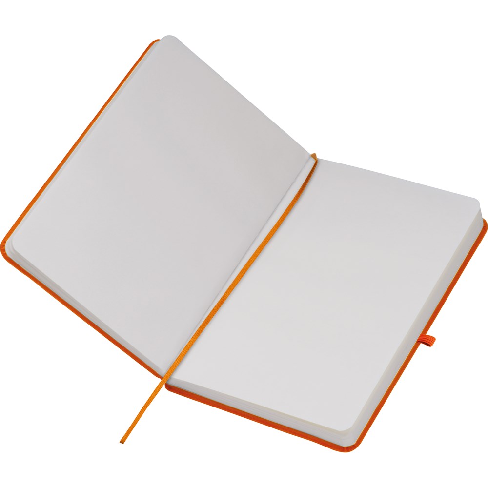 TOP PRICE! Notizbuch A5 im samtweichen PU-Einband, Kugelschreiberschlaufe, Lesezeichen, Gummiverschlussband und 160 Blankoseiten. Ihre Werbung drucken wir per Tampondruck auf das Cover.