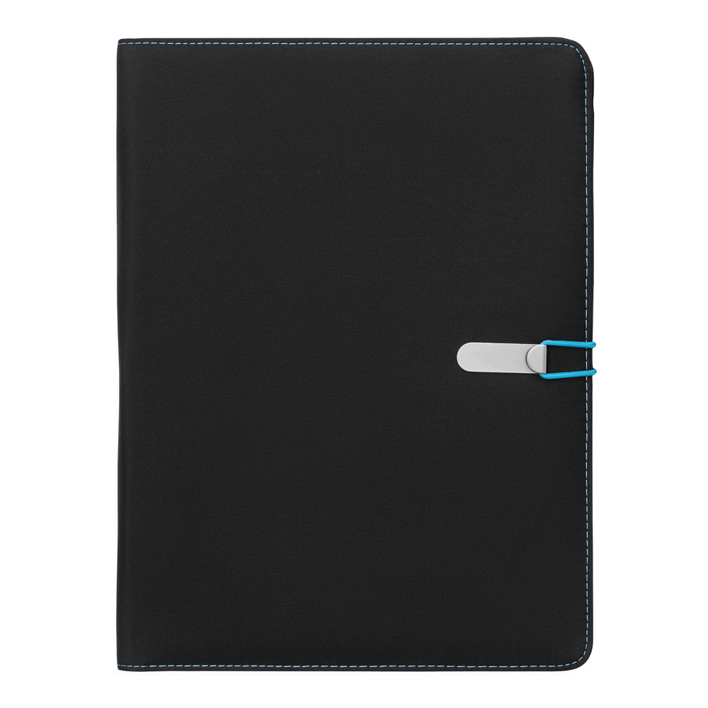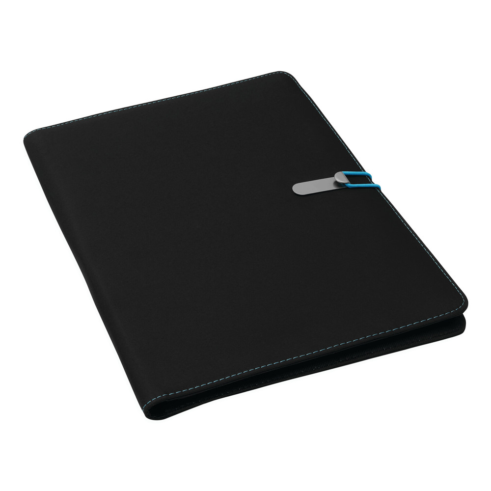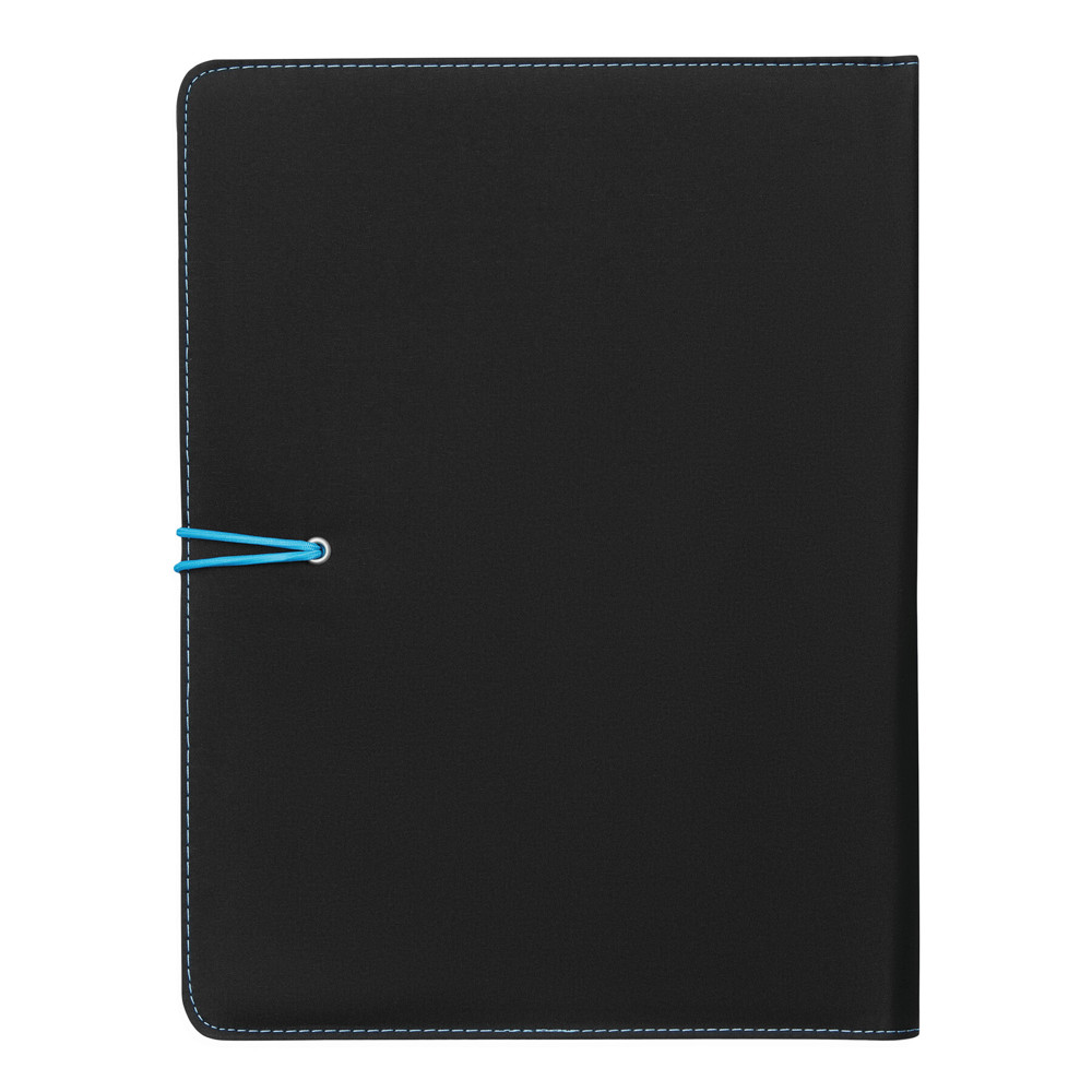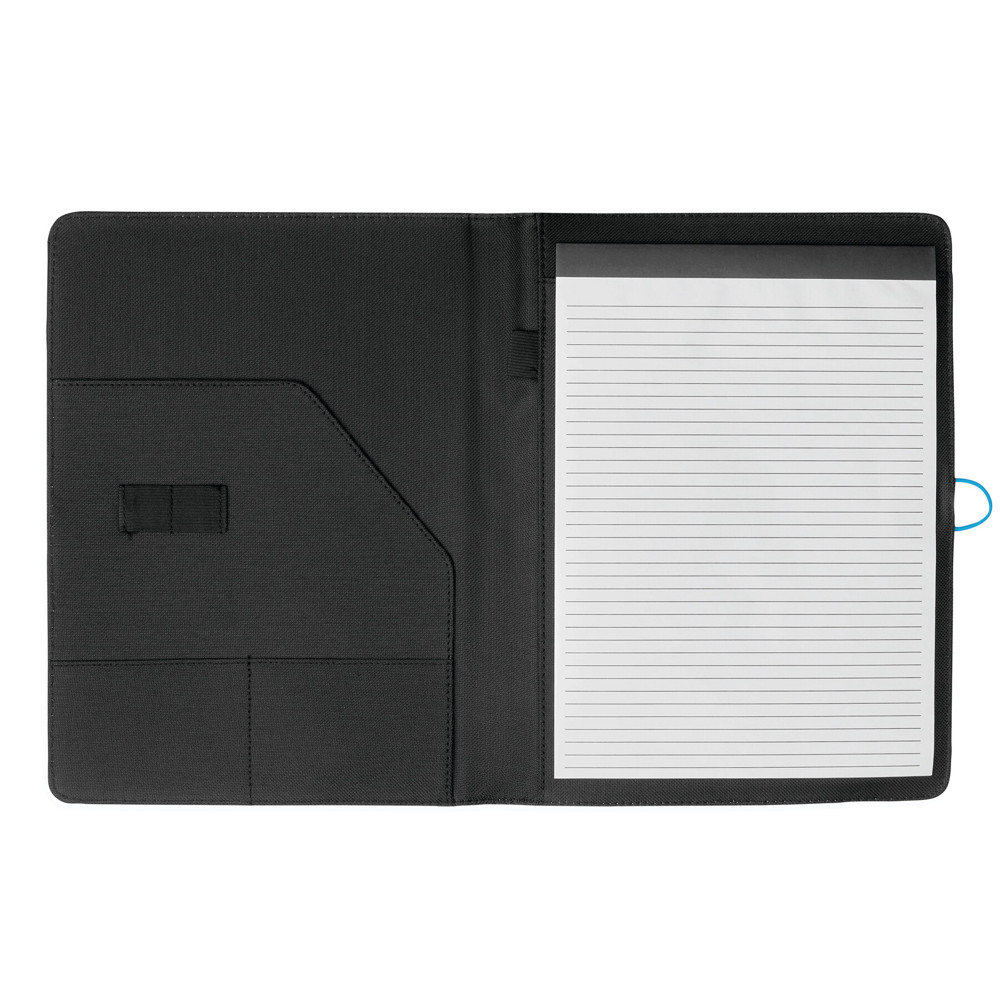 Konferenzmappe SESSION im DIN-A4-Format: Metallhaken mit farbigem Gummiband zum Verschließen, innen diverse Einsteckfächer, 2 elastische Schlaufen, inkl. Schreibblock (liniert), Schlaufe für 1 Schreibgerät, außen mit farbigen Ziernähten