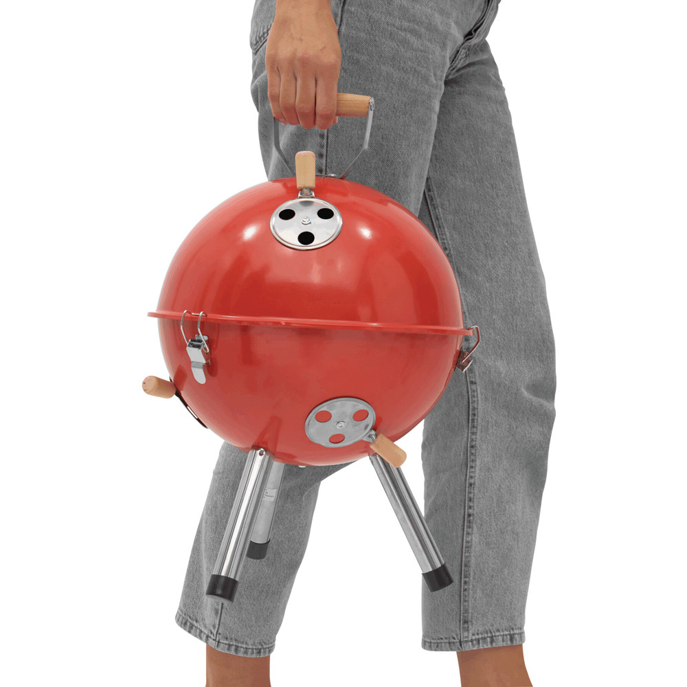 Kugelgrill COOKOUT: Metall-Korpus mit 2 Belüftungsfenstern, herausnehmbare Schale mit Luftlöchern für Kohle, herausnehmbarer Grillrost Ø ca. 29 cm, Garhaube mit Belüftungsfenster und Holzgriff, 3 Schnappverschlüsse zum Befestigen der Haube am Metall-Korpus, 3 Metallfüße mit Kunststoffkappen, in Box