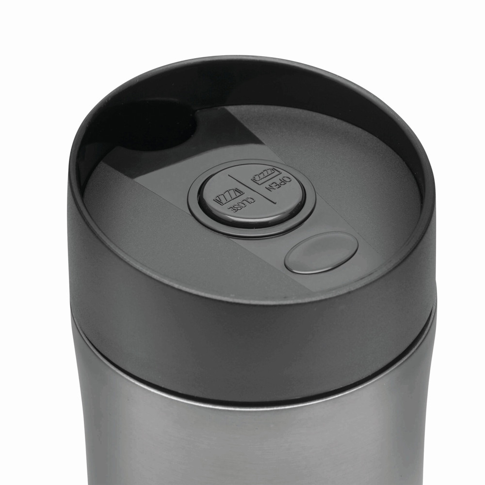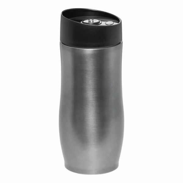 Isolierbecher CLASSICO, doppelwandig: innen und außen aus Edelstahl, Kunststoff-Deckel mit sicherem Schraubverschluss, Push-Button OPEN/CLOSE und integrierter Trinköffnung, gummierter Standfuß für gute Bodenhaftung, Füllmenge ca. 380 ml, in Box