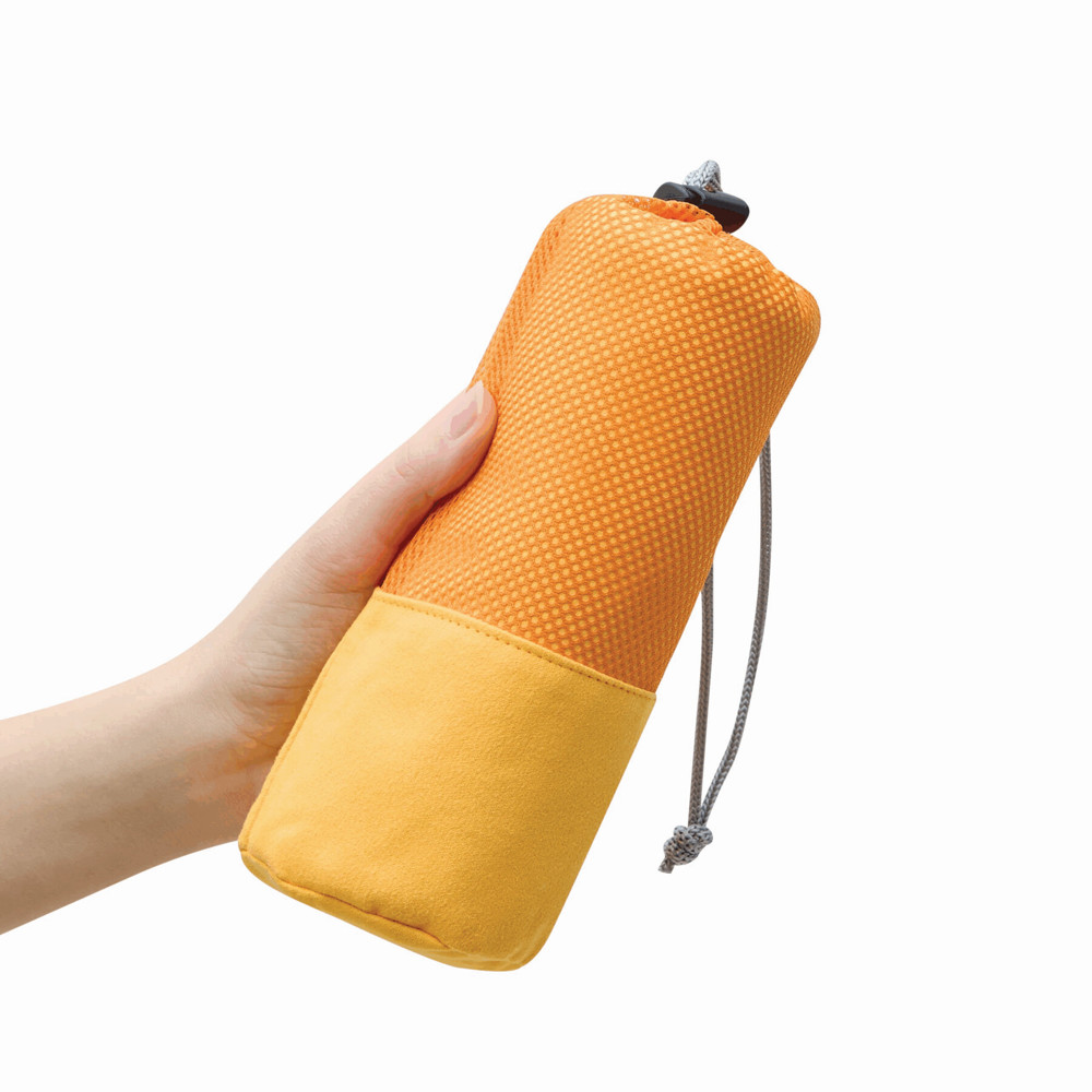 Mikrofaser-Handtuch FRESHNESS: saugstark und schnelltrocknend, mit weicher Oberflächenstruktur, in farblich passender Netztasche mit Zuziehband und Kunststoffstopper