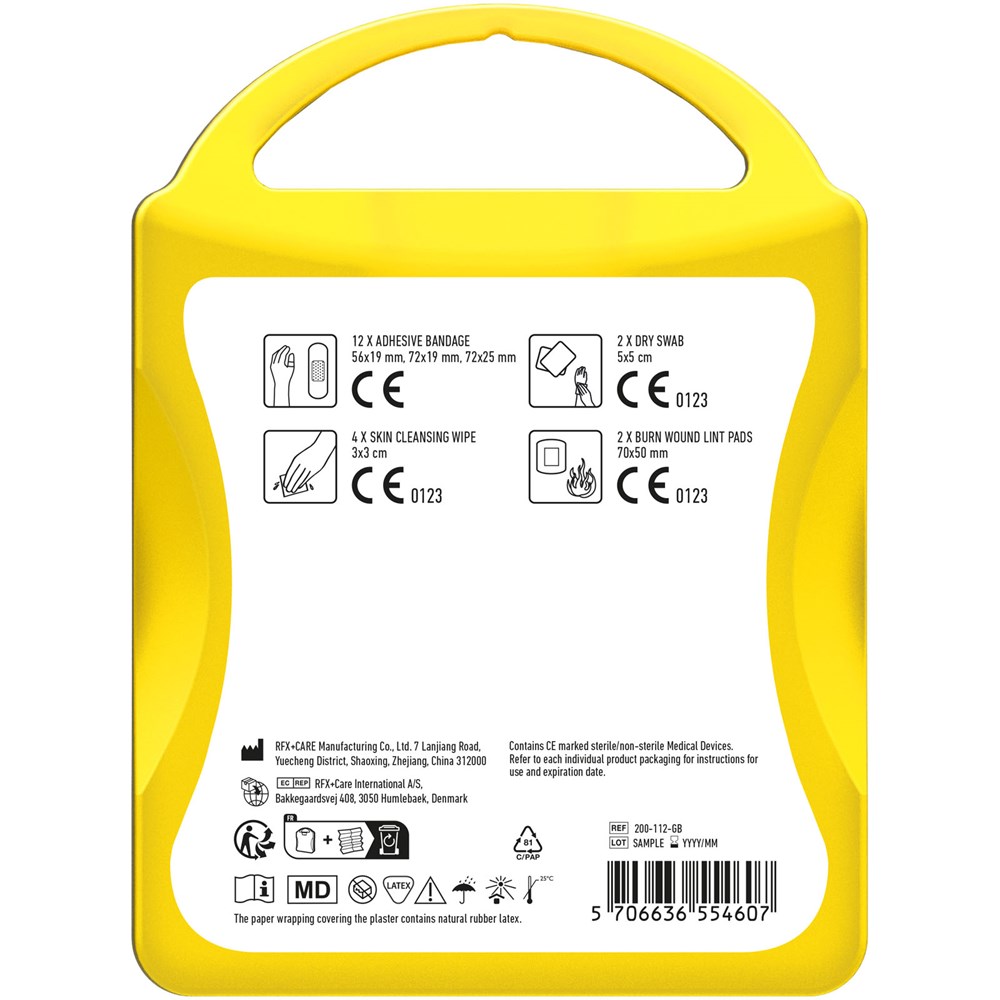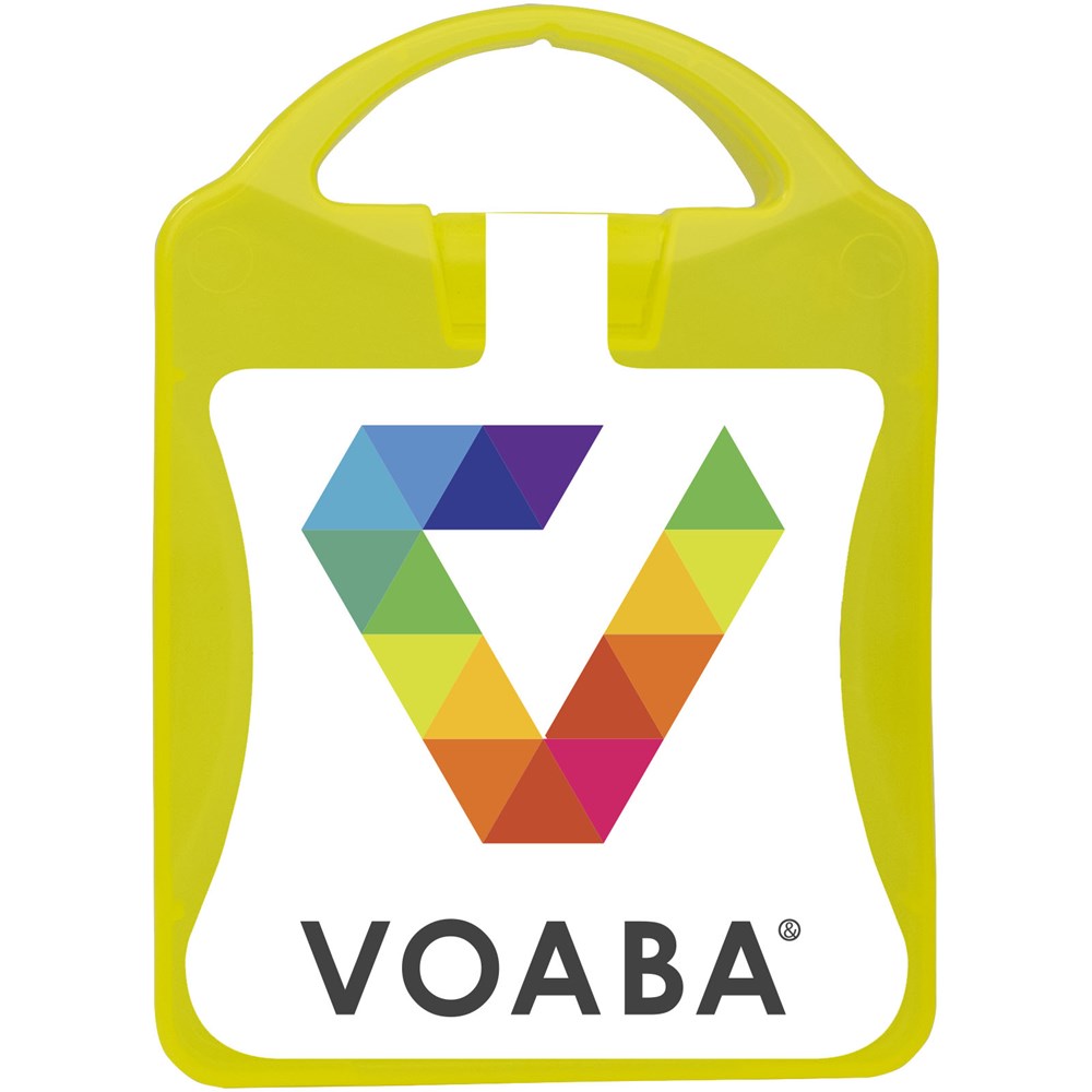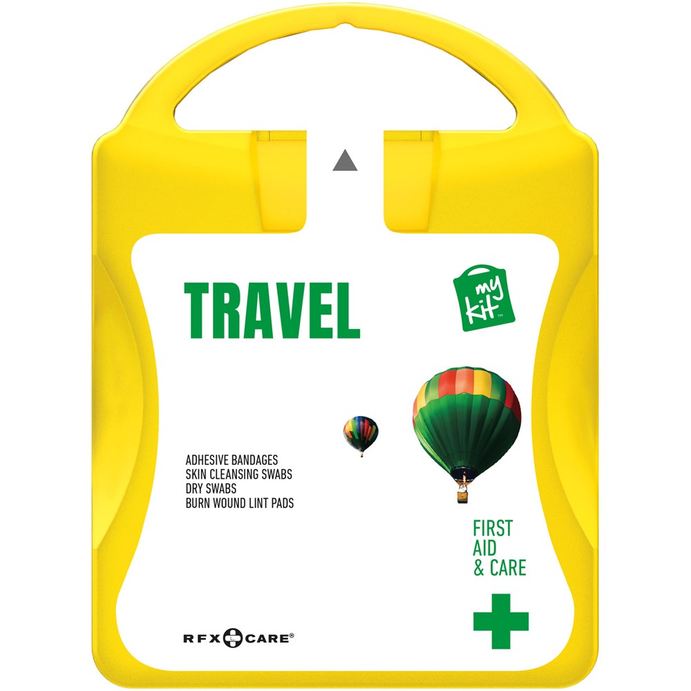 Erste-Hilfe Set für Reisende. Mit diesem Set sind Sie vorbereitet um Verletzungen während Ihrer Reise zu behandeln. Inhalt: 12 wasserfeste Pflaster, 4 hautreinigende Tupfer, 2 Trockentupfer, 2 Mullbinden für Brandwunden. Alle im Set enthaltenen Erste-Hilfe- und Pflegeprodukte erfüllen alle geltenden EU-Vorschriften. Preis inkl. vollfarbigem Druck.