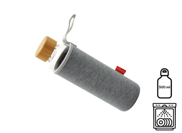 Einwandige Glasflasche aus Borosilikat. Schraubverschluss mit Bambusbeschichtung und Silikondichtung für eine perfekte Abdichtung. Kompatibel (ohne Deckel) mit Spülmaschine. Schutzhülle aus meliertem grauem Neopren. Fassungsvermögen: 500 ml.