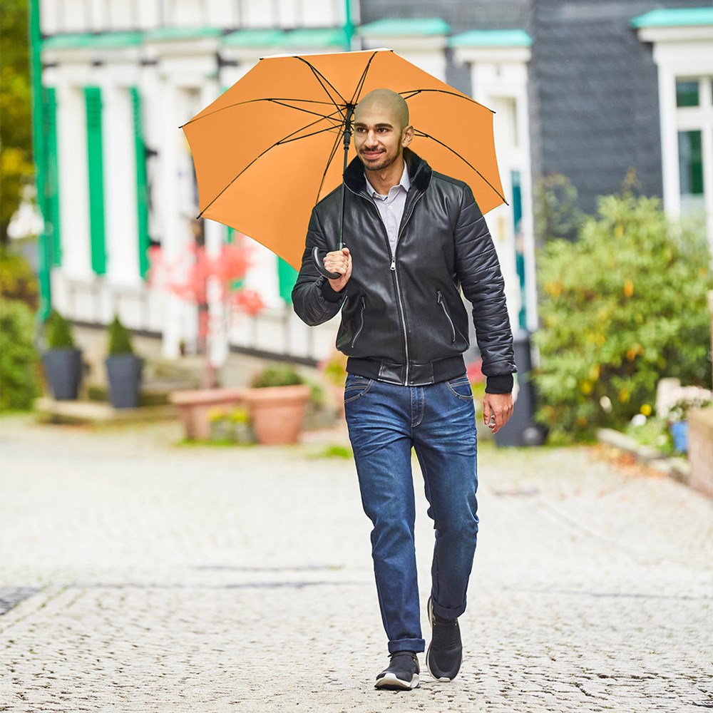 Preislich attraktiver Automatik-Stockschirm mit Windproof-System Komfortable Automatik-Funktion zum schnellen Öffnen, Windproof-System für höhere Gestell-Flexibilität und bessere Windsicherheit, flexible Fiberglasschienen, matt-schwarzer Kunststoff Rundhakengriff, höherer Korrosionsschutz durch schwarze Galvanisierung des Stahlstocks. Auch als Gästeschirm (Art. 2359) erhältlich.