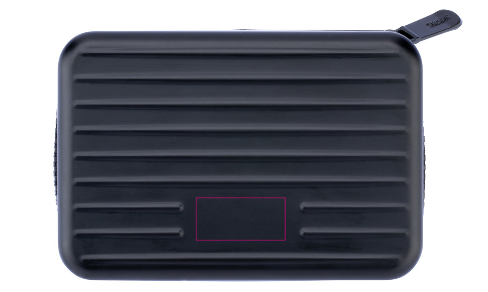 Kreditkartenetui im Stil eines Hartschalenkoffers, Reißverschluss, mit Ausleseschutz (für RFID Chips), 9 Fächer mit Platz für ca. 20 Karten, Geld und Belege, Aluminium, Polyester, matt, schwarz