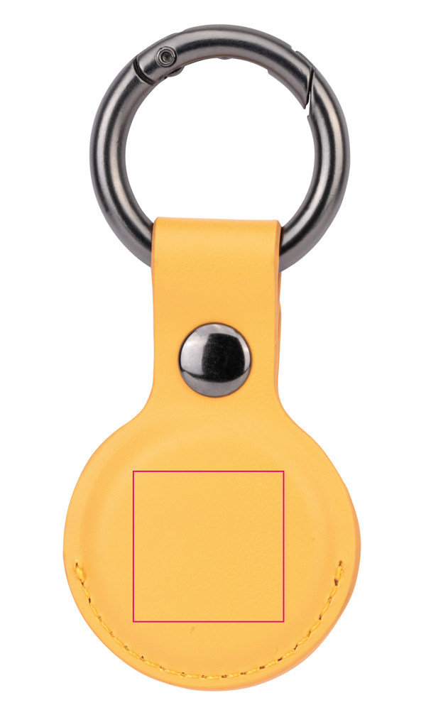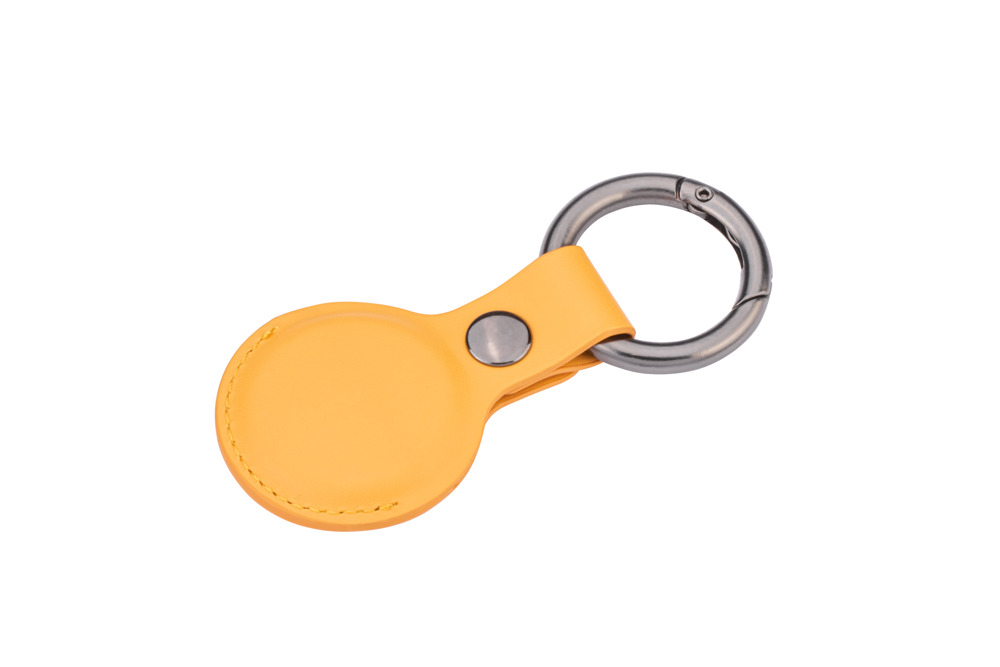 Schlüsselanhänger / Schutzhülle für APPLE AirTag®, mit Karabiner für flexible Befestigung an: Schlüsselbund, Rucksack, Laptoptasche, etc., Druckknopf als Schließe, Kunstleder, matt, gelb/gunmetal