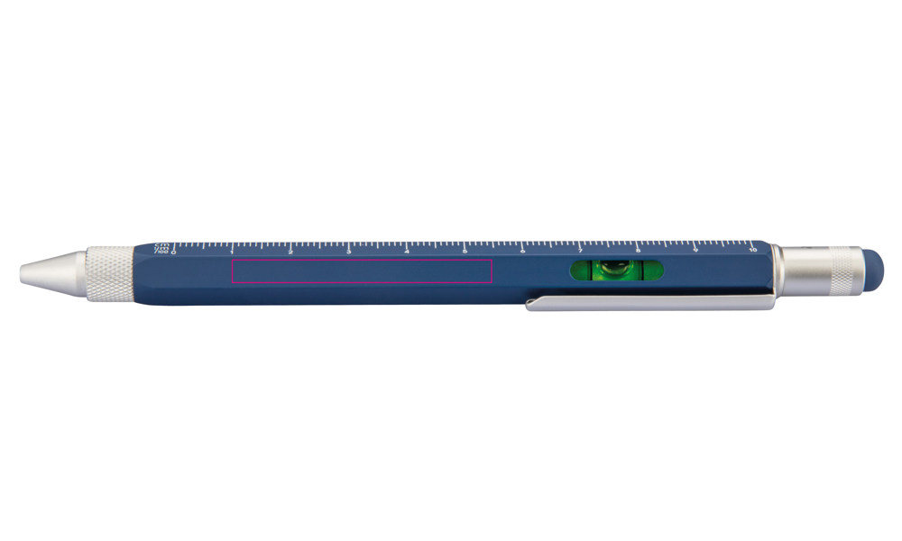 Multitasking-Kugelschreiber, Zentimeter-/Zoll-Lineal, 1:20/1:50 Skala, Wasserwaage, Schlitz-/Kreuzschraubendreher, Stylus, schwarze Mine, Messing, lackiert, blau/silberfarben