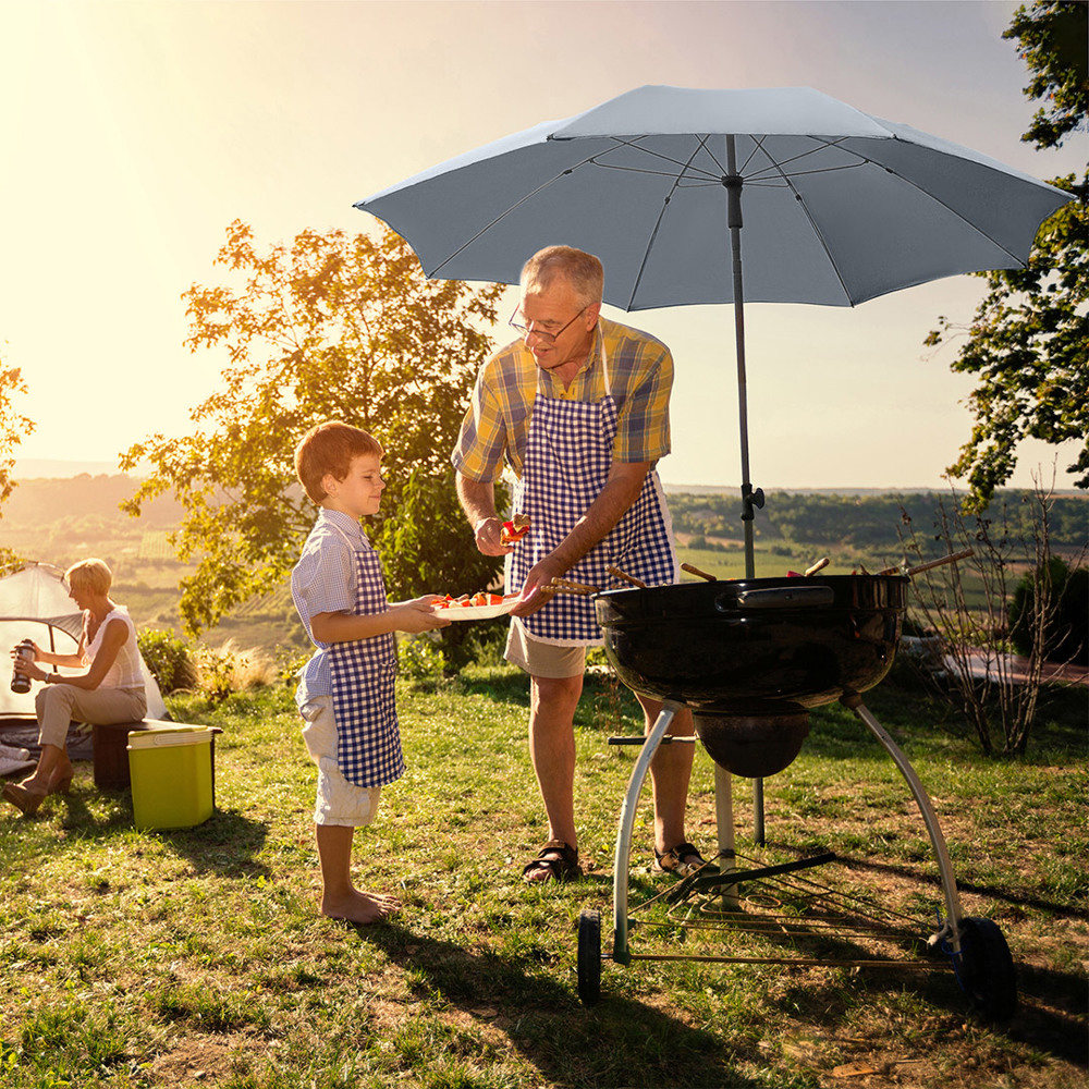 Moderner Sonnenschirm mit Gestell in Titan-Finish und Knickvorrichtung Einfache Handhabung durch Sicherheitsschieber, sehr stabile Fiberglasschienen, zweiteiliger und stufenlos höhenverstellbarer Stock mit Knickvorrichtung zur Neigung des Schirms, Schienen und Stock in edlem Titan-Finish, Unterstock mit ca. 125 cm Länge und Drehfeststeller zur sicheren Fixierung, komfortables Tragefutteral, hochqualitativer Bezug mit einer Grammatur von ca. 200 g/m² und Lichtschutzfaktor UPF 50+, überlappender Ventilationsbezug zur Regulierung von Überdruck durch stärkere Windböen, exklusive Füllständer (Art. 8920)
