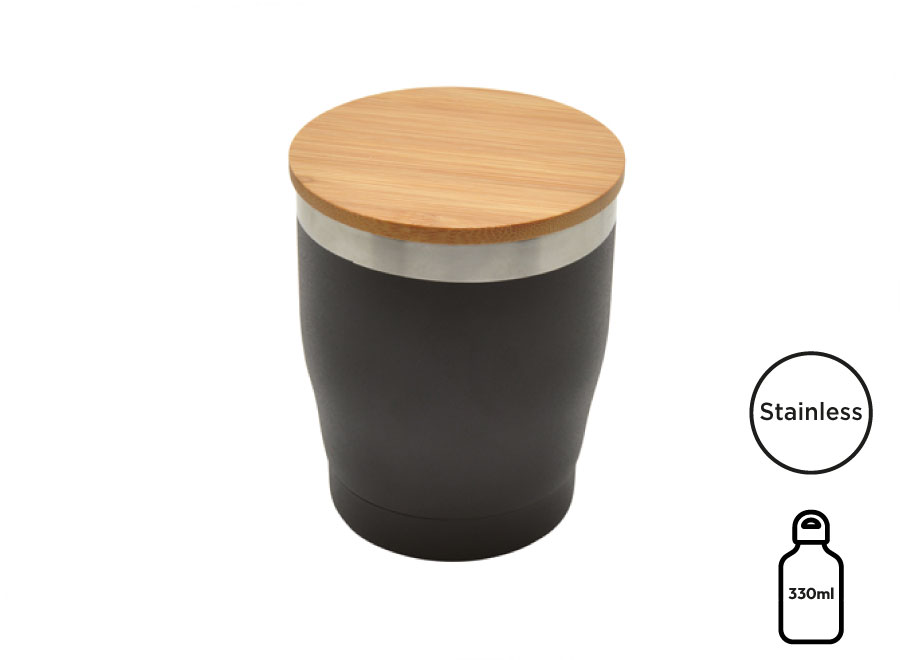 Doppelwandiger Isolierbecher aus rostfreiem Edelstahl 18/8. Deckel aus Bambus mit Silikondichtung. Fassungsvermögen: 330 ml.