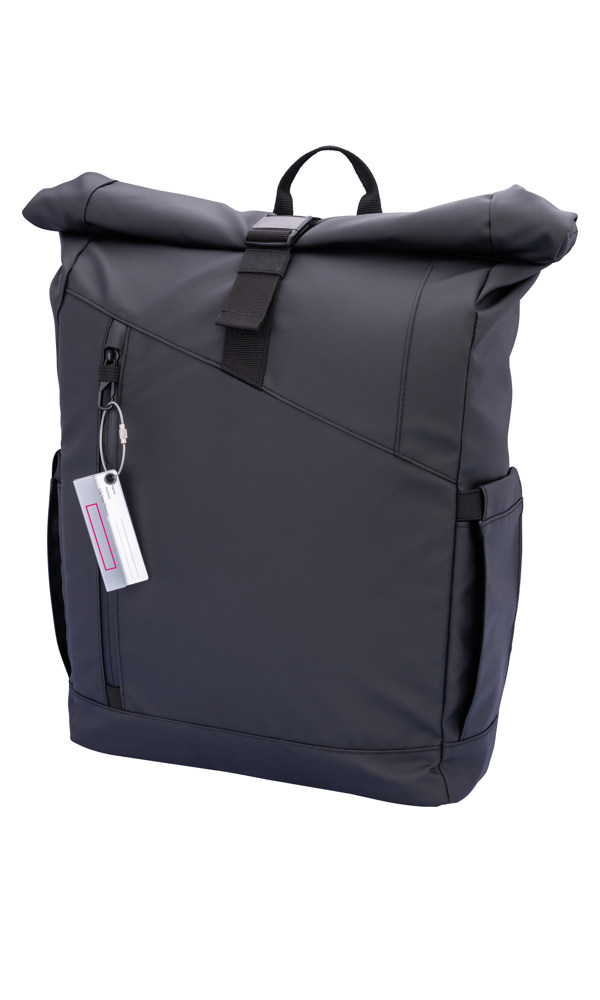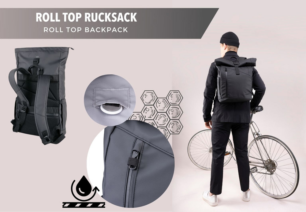Roll Top Rucksack mit magnetischem Sicherungsverschluss aus Metall, wasserabweisende Reißverschlüsse außen, Hauptfach: 1 Reißverschlussfach inkl. Geheimfach für mini Tracking-Geräte (z.B. APPLE AirTag®) + 2 Einschubfächern mit Klettverschluss, Fronttasche mit versteckbarem Reißverschluss-Schieber als Mini-Karabiner (Diebstahlschutz), 2 Seitentaschen, rückseitiges Geheimfach, gepolsterte Schultergurte, Schlaufe zur Befestigung am Trolley, abgesetzter Standboden, Kapazität ca. 17,5 Liter, Tragkraft bis zu 15 kg, widerstandsfähiges Material, spritzwassergeschützt (Wasserdichtheitsgrad IPX4), Tarpaulin: 80% Polyester, 20% Polyurethan (PU), Polyester, Polyurethan, Tarpaulin (Plane), schwarz