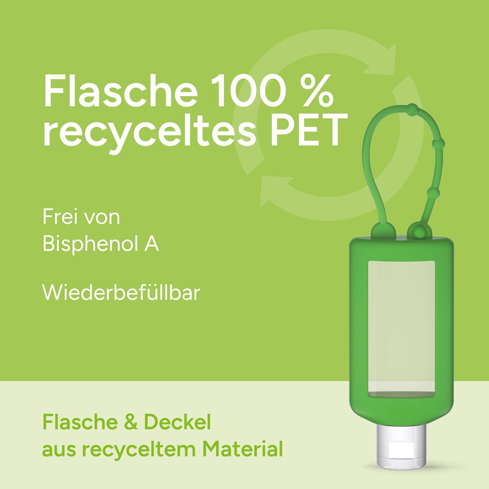 50 ml Flasche aus 100% recyceltem PET, transparent mit leichter R-PET-Färbung. Mit Klappdeckel "weiß" aus recyceltem PP, zufällig ausgerichtet; Silikonhülle und Schlaufe in grün. Nachfüllbar.