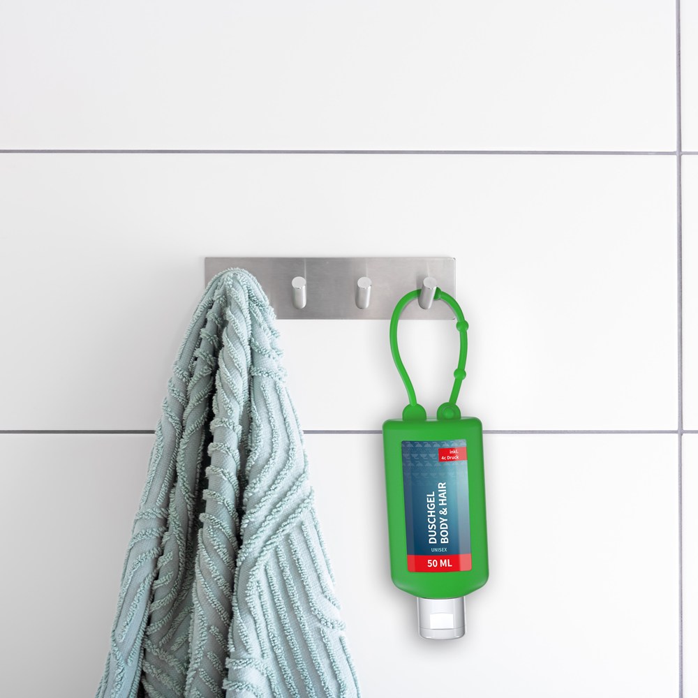 Das Fläschchen mit Silikonhülle ist nicht nur optisch ein echter Hingucker! Raffiniert mit Schlaufe zum Anhängen an den Rucksack, an die Sporttasche, an den Kinderwagen oder natürlich im Bad unter der Dusche.