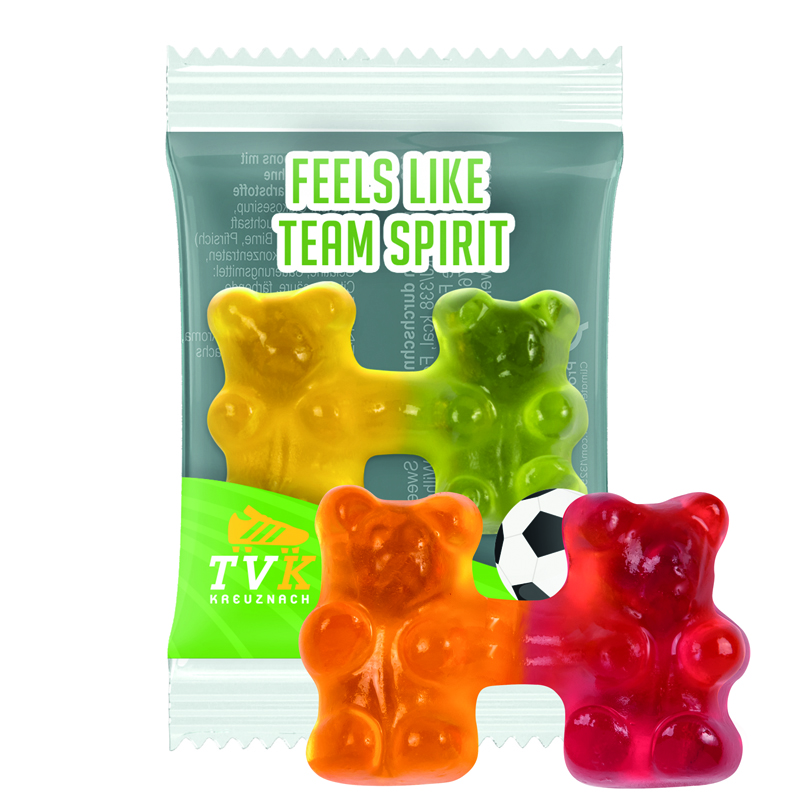 Trolli Team Gummibärchen im Flowpack aus weißer, kompostierbarer Folie, individuell bedruckt. Inhalt: Trolli Fruchtgummi Team Bärchen in Premium Qualität mit 10 % Fruchtsaftanteil, bunt gemischt aus den Sorten, Zitrone, Erdbeere, Orange, Ananas. Nur in Hochformat erhältlich. Farbreihenfolge im Paar kann variieren. Sonderfarben und -geschmacksrichtungen ab 70.000 Stück auf Anfrage, 6,5 g