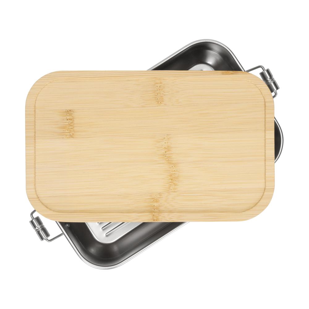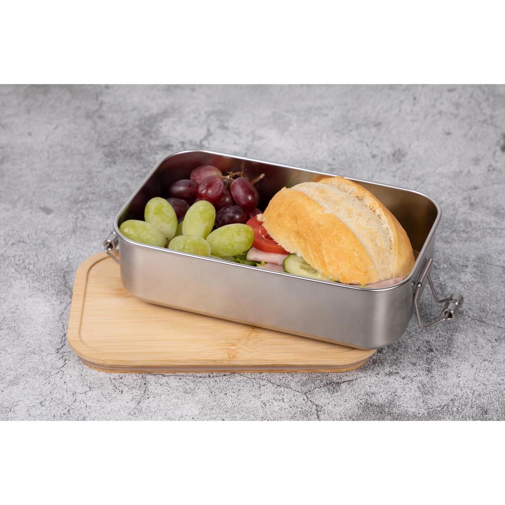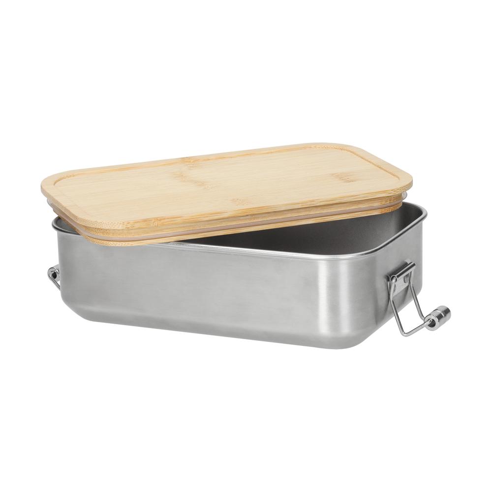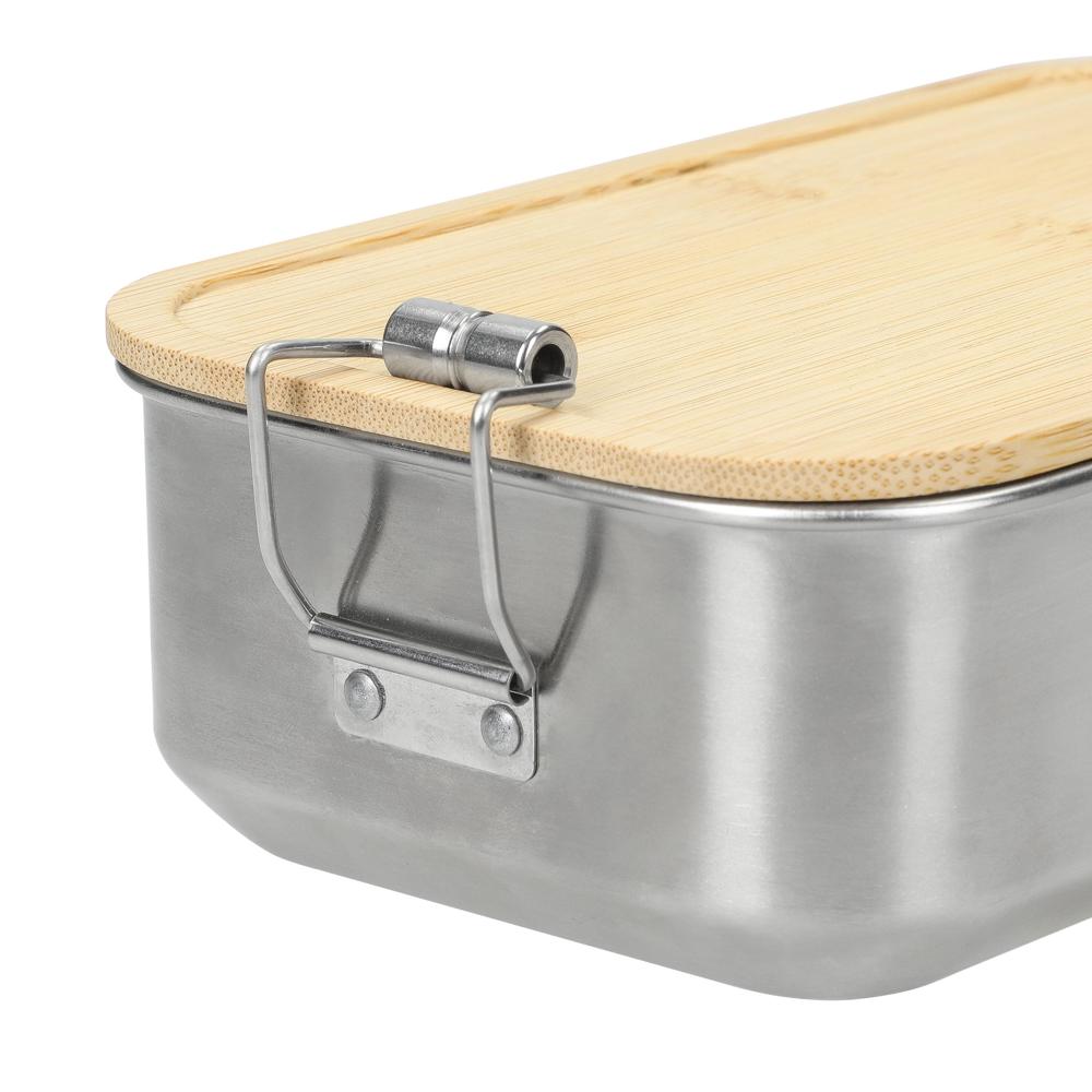 Edel und praktisch. Die große Vorratsdose besteht aus Edelstahl, der zugehörige Deckel aus Bambus. Dank des eingepassten Silikonrings und der beiden Klemmbügel lässt sich die Box sicher verschließen. Der Deckel ist abnehmbar und kann bei Bedarf auch als Brotzeitunterlage verwendet werden.
