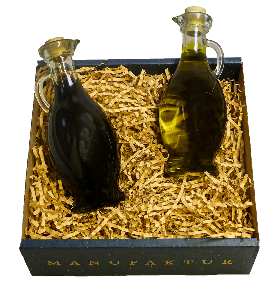 Gefüllt mit einem mild-fruchtigen Olivenöl nativ extra und einem charaktervollen Aceto Balsamico di Modena, verbindet dieses Präsent klassische Genussqualität mit moderner Markeninszenierung.