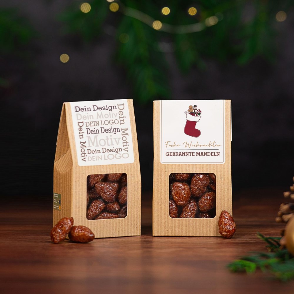 Ab 500 Stück mit Ihrem Motiv im 4c Druck auf dem Etikett der Faltschachtel, ab 2.500 Stück vollflächig bedruckt im Offsetdruck: Unser aufmerksamkeitsstarker Bestseller. Die Mini-Faltschachtel als nachhaltiges Premium-Giveaway. Gebrannte Mandeln mit einem Hauch Zimt. Der Klassiker erinnert mit seinem Karamell-Aroma an die Düfte auf dem Weihnachtsmarkt. Sie suchen eine andere Größe? Dieses Premium Präsent ist auch als Faltschachtel und Maxi Faltschachtel erhältlich.
