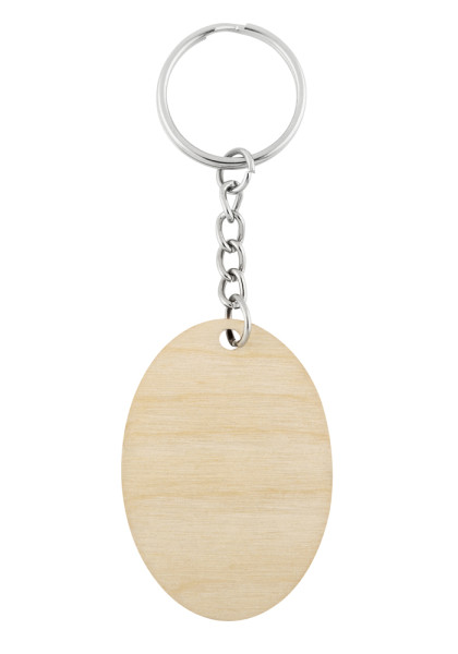 Handgefertigter Holz Schlüsselanhänger aus FSC-zertifiziertem Buchenholz, Made in Europe - mit Metallschlüsselring - tolle Werbefläche - ideal für Brandlasergravuren VPE 500. Designkarte